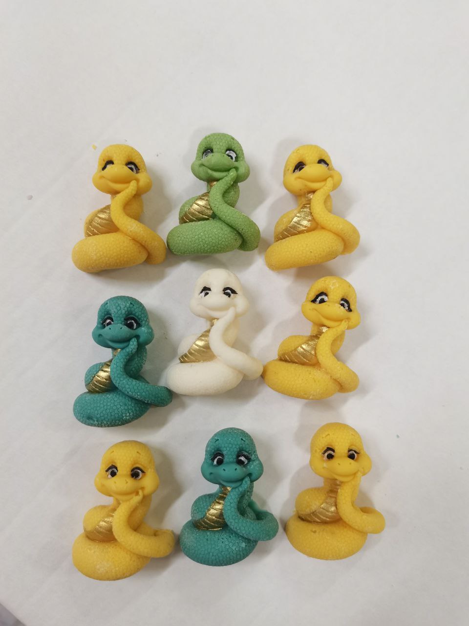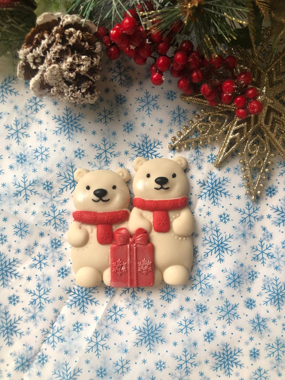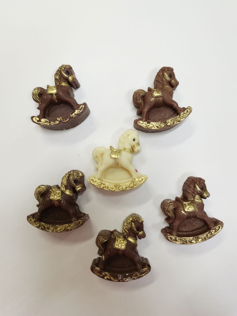 Фигурки выполнены из кондитерской белой или молочной глазури, элементы покрашены золотым кандурином.