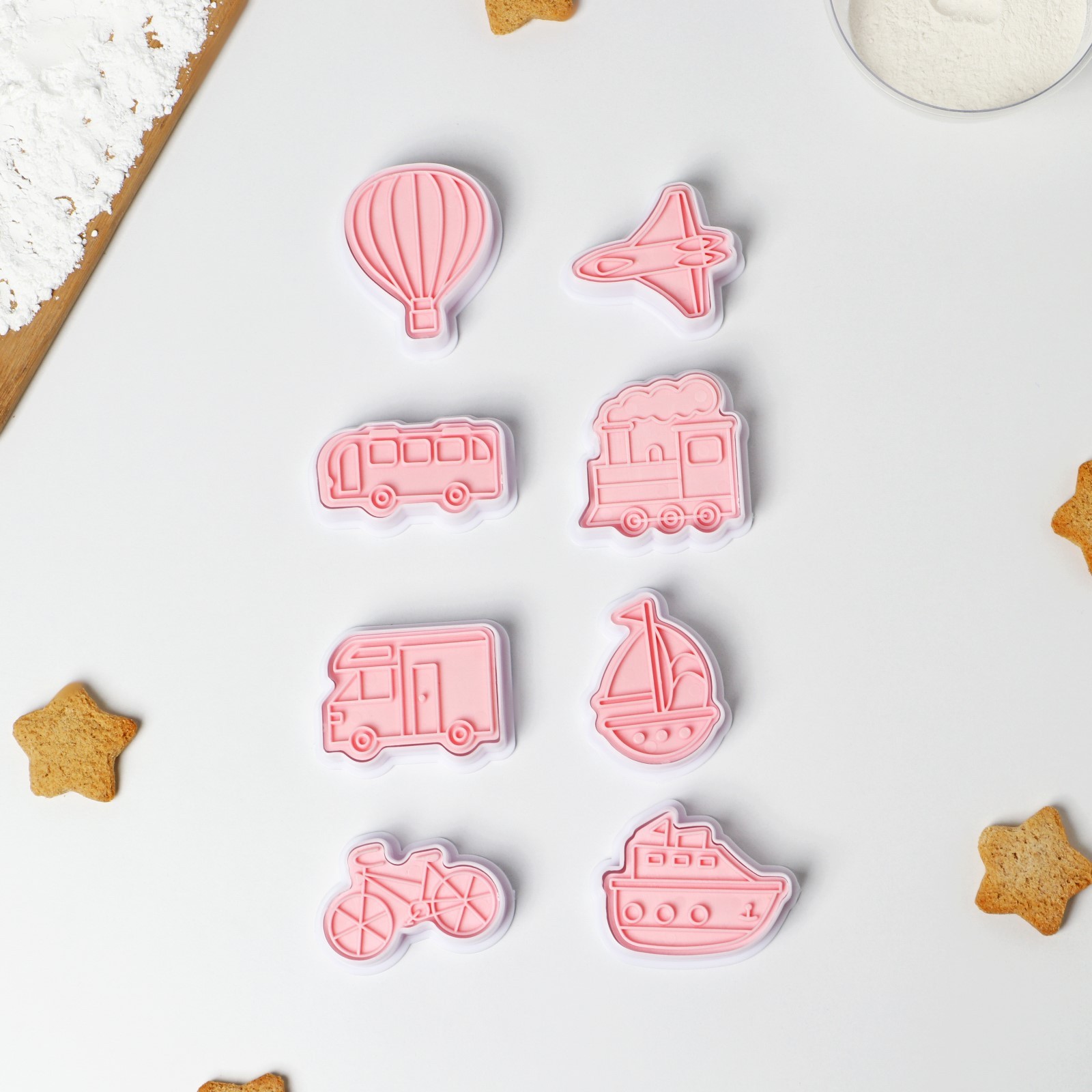 "Рифленные цветы", 5 шт, "Звездочки" 6 шт, "Кролик", "Круги" 5 шт, "Рифленные квадраты", 5 шт, "Русский алфавит", "Сердца", «Пряничный человечек», «Транспорт», Круг/волна