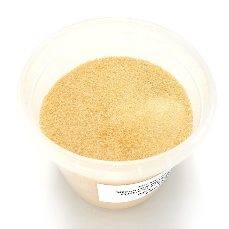 Пищевой желатин 220 blum, производится в виде мелкокристаллического порошка бледно-желтого цвета.